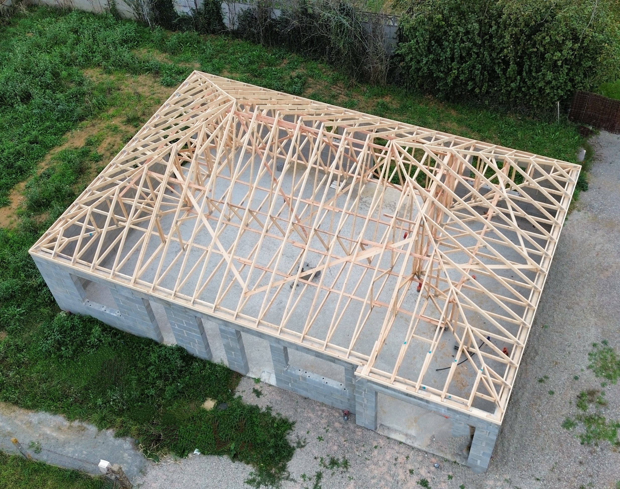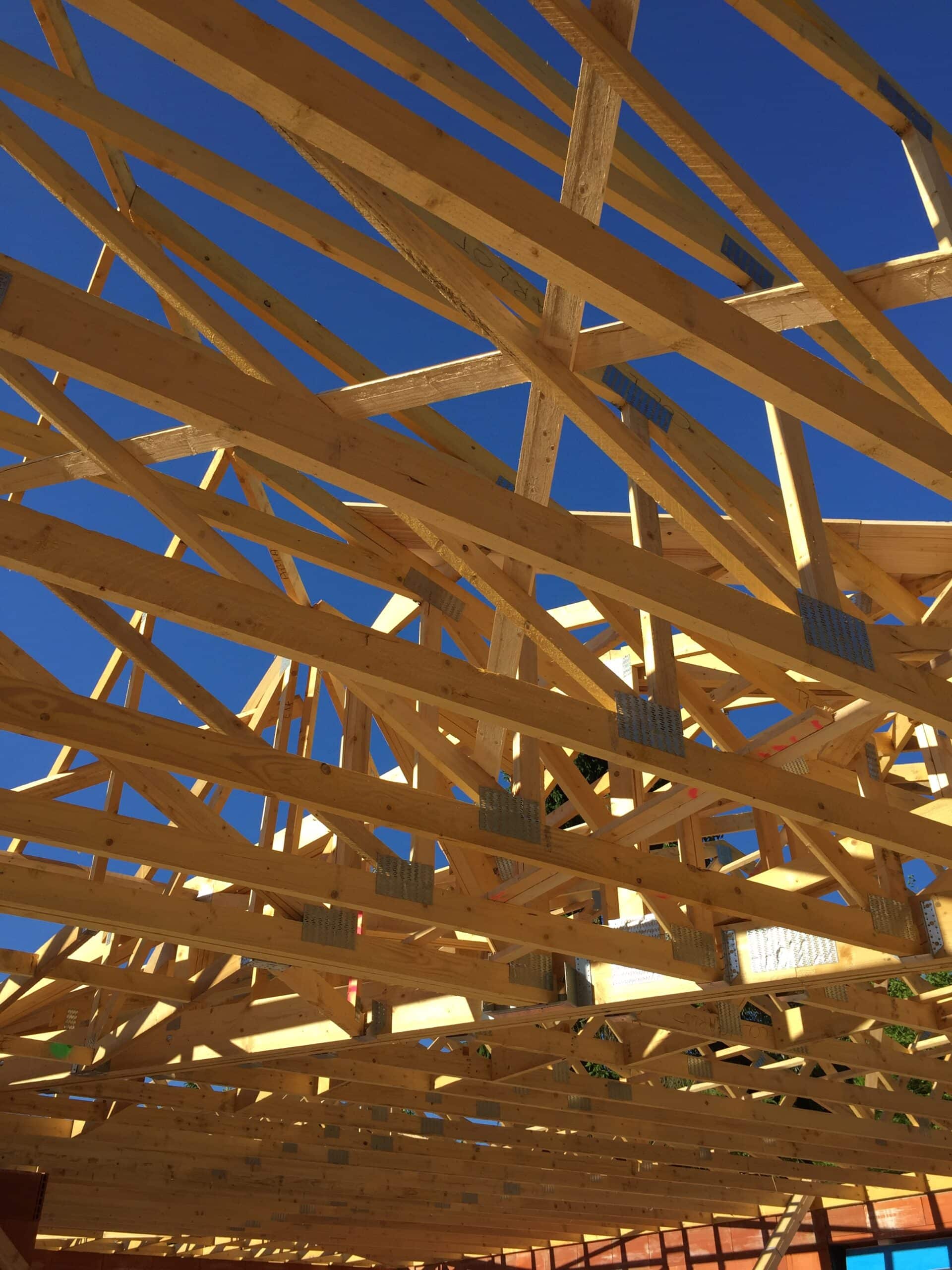 La charpente industrialisée bois, est composée d’un ensemble de bois triangulés (appelés fermettes ou charpente américaine) assemblés par connecteurs métalliques.